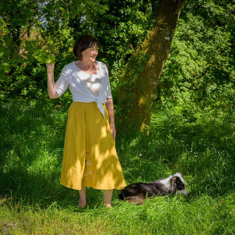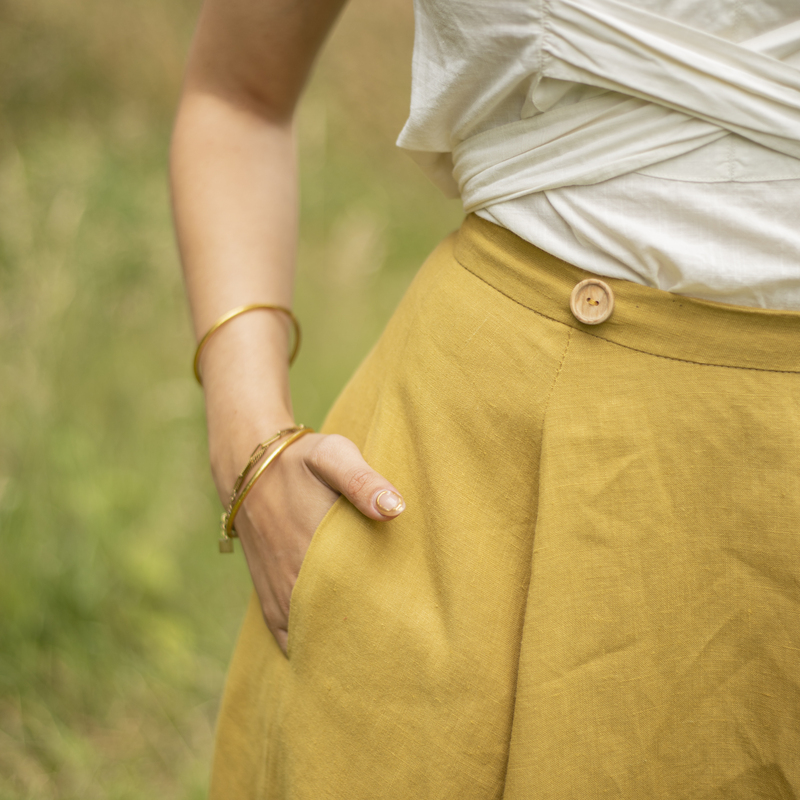Cette jupe est réalisée dans une toile de lin haut de gamme, entièrement française, pour une qualité et un confort incomparables. Prélavée avant la coupe, elle conserve sa forme au fil des lavages. Le modèle en photo est présenté ici en coloris jaune moutarde.