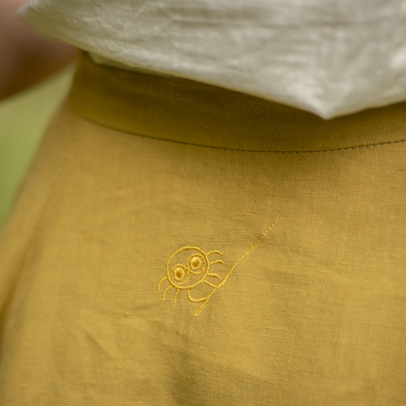Parce que chaque couleur de lin a sa propre personnalité, les fils de broderie sont sélectionnés avec soin pour s’harmoniser au mieux. Cette légère variation d’une jupe à l’autre garantit une pièce unique, conçue rien que pour vous.