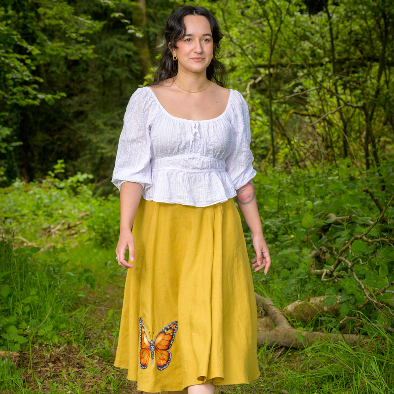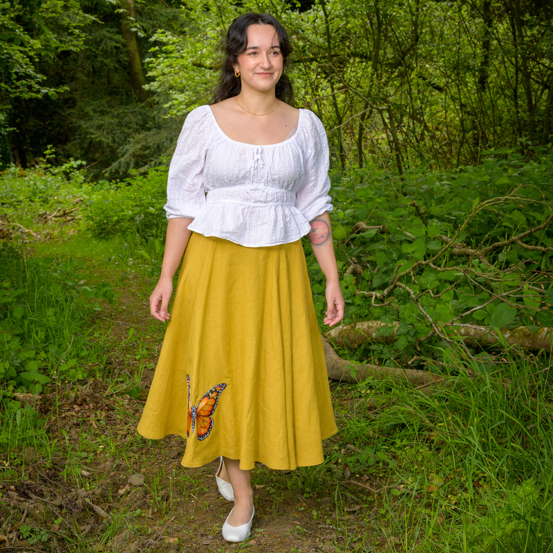 Le tissu utilisé est un lin français de qualité supérieure, lavé avant la confection pour éviter toute mauvaise surprise au lavage. Douce et respirante, la jupe assure un confort durable. Celle présentée sur les photos est faite en lin jaune moutarde.